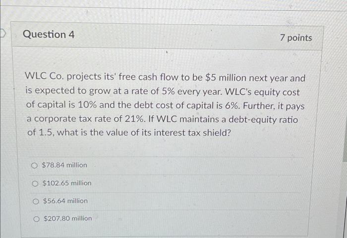 Solved Question 4 7 Points Wlc Co Projects Its Free Cash Chegg Com